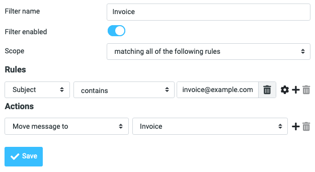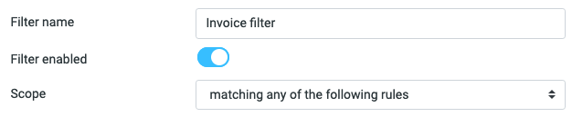 - Gå til Indstillinger → Filtre (avanceret) og klik på opret (plustegn) øverst til højre for at oprette en ny regel. Navngiv filteret, f.eks. "Fakturafilter". Sørg for, at filteret er aktiveret, og indstil Omfang til at matche en af følgende regler.