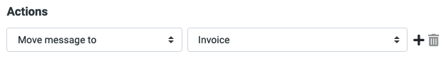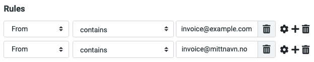 Du kan f.eks. tilføje kendte fakturaafsendere ved at tilføje en regel for hver afsender med Fra indeholder og indtaste afsenderens e-mailadresse. Opret yderligere regler ved at klikke på plustegnet ud for reglen: