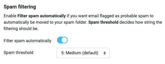 Hvis du modtager meget spam, eller hvis legitim e-mail leveres til din spammappe, kan du nemt justere, hvor aggressivt standardfilteret er, det vil sige, hvor høj scoren skal være, før en besked betragtes som spam.