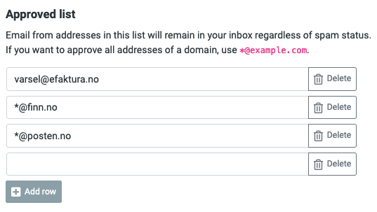 Det er muligt at angive godkendte lister eller blokeringslister for afsendere. Dette tilsidesætter almindelig spamfiltrering og sikrer, at e-mails fra disse afsendere placeres i din indbakke (godkendt liste) eller spamboks (blokeringsliste).